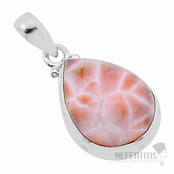 Silberanhänger mit Natrolith. 925er Silber. Natrolith ist ein Stein des persönlichen Wachstums, der mit dem Kronenchakra und dem Stirnchakra in Resonanz steht und so Kommunikation und Konzentration fördert. Sie erwerben den abgebildeten Schmuck.