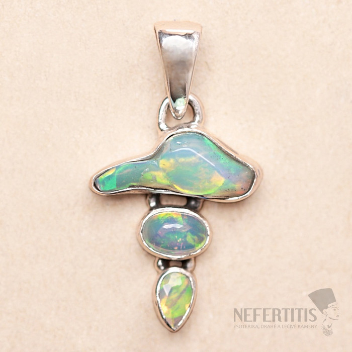 Moderner und eleganter Silberanhänger mit äthiopischem Opal in drei Varianten – roh poliert, als polierter Cabochon und als geschliffener Tropfen – mit einem wunderschönen Farbenspiel. Silber 925. Ein beeindruckendes und elegantes Schmuckstück, das schon beim Anblick Freude und Harmonie ausstrahlt. Äthiopische Opale, im Vergleich zu australischen Opalen, schimmern in leuchtenden Farben. Auch wenn es auf den ersten Blick nicht so scheint, wird das Farbenfeuerwerk, das der Opal in diesem Anhänger bei jedem Lichteinfall entfacht, nicht nur Sie, sondern Ihre ganze Umgebung verzaubern. Sie erwerben das abgebildete Schmuckstück.