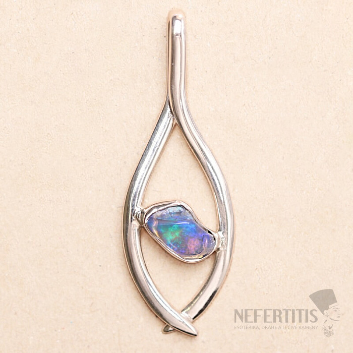 Moderner und eleganter Silberanhänger mit roh poliertem Opal, der ein wunderschönes Farbenspiel entfaltet. Silber 925. Ein beeindruckendes und elegantes Schmuckstück, das schon beim Anblick Freude und Harmonie ausstrahlt. Äthiopische Opale, im Gegensatz zu australischen Opalen, schimmern in leuchtenden Farben. Auch wenn es auf den ersten Blick nicht ersichtlich ist, wird das Farbenfeuerwerk, das der Opal in diesem Anhänger bei jedem Lichteinfall entfacht, nicht nur Sie, sondern Ihre gesamte Umgebung verzaubern. Sie erwerben das abgebildete Schmuckstück.