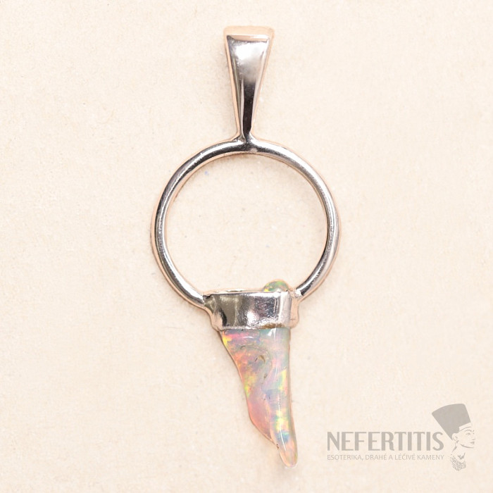 Moderner und eleganter Silberanhänger mit rohem äthiopischem Opal in Zahnform, der ein wunderschönes Farbenspiel entfaltet. Silber 925. Ein beeindruckendes und elegantes Schmuckstück, das schon beim Anblick Freude und Harmonie ausstrahlt. Äthiopische Opale, im Gegensatz zu australischen Opalen, schimmern in leuchtenden Farben. Auch wenn es auf den ersten Blick nicht so scheint, wird das Farbenfeuerwerk, das der Opal in diesem Anhänger bei jedem Lichteinfall entfacht, nicht nur Sie, sondern Ihre gesamte Umgebung verzaubern. Sie erwerben das abgebildete Schmuckstück.