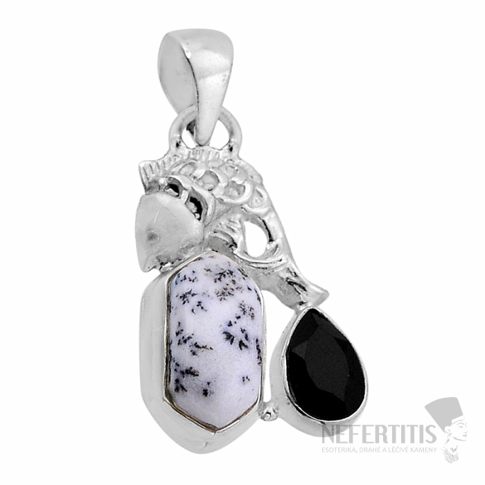 Bezaubernder Silberanhänger mit dendritischem Opal , dessen weiß-graue Farbe und wunderschöne Einschlüsse an eine verschneite Landschaft erinnern, wie sie von alten chinesischen Landschaftsmalern geschaffen wurde, und geschliffenem Onyx. Zart und filigran, aber dennoch unverwechselbar und attraktiv. Ein außergewöhnlich schöner Stein, den wir nur selten im Sortiment haben. Silber 925. Sie erwerben direkt das abgebildete Schmuckstück.