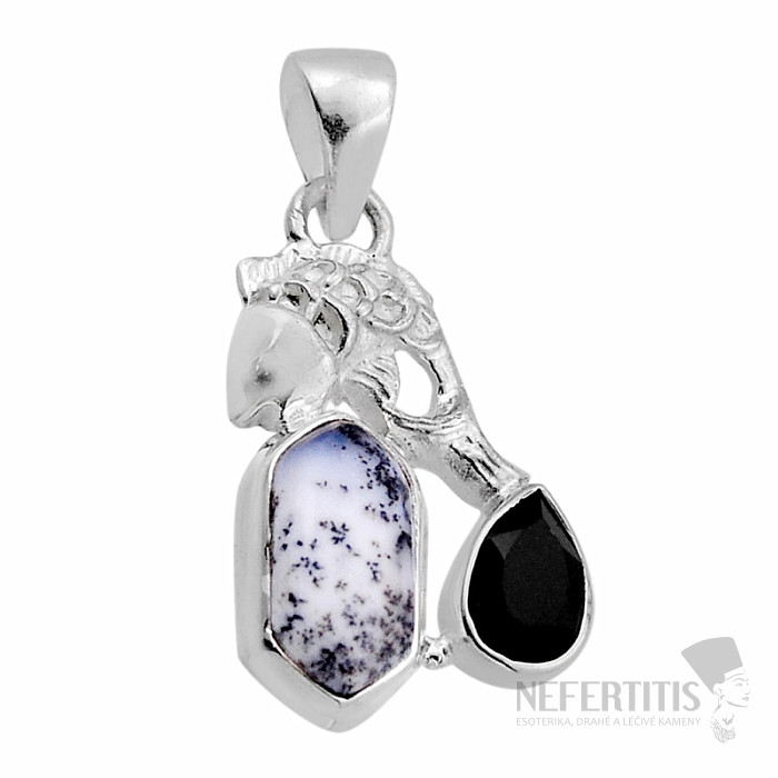 Bezaubernder Silberanhänger mit dendritischem Opal , dessen weiß-graue Farbe und wunderschöne Einschlüsse an eine verschneite Landschaft erinnern, wie sie von alten chinesischen Landschaftsmalern geschaffen wurde, und geschliffenem Onyx. Zart und filigran, aber dennoch unverwechselbar und attraktiv. Ein außergewöhnlich schöner Stein, den wir nur selten im Sortiment haben. Silber 925. Sie erwerben direkt das abgebildete Schmuckstück.