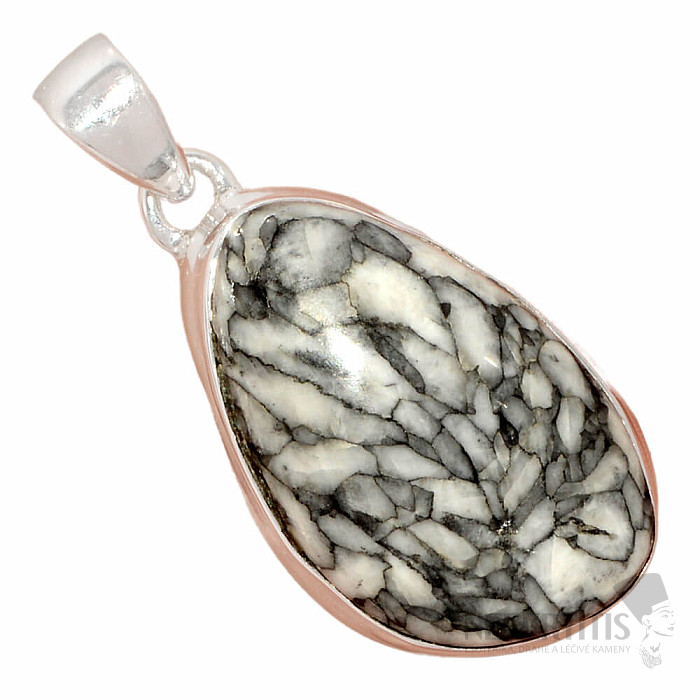 Silberanhänger mit einem dekorativen, seltenen Pinolith in Silberfassung. Silber 925. Pinolith symbolisiert vorwiegend das Männliche. Es handelt sich um einen graphitpigmentierten, hellgrauen bis fast schwarzen Dolomit mit Einschlüssen weißer Magnesitkörner, die an Kiefernsamen erinnern. Daher leitet sich auch der Name Pinolith ab, da Kiefer im Lateinischen „pinus“ heißt. Sie erwerben direkt den abgebildeten Schmuck.
