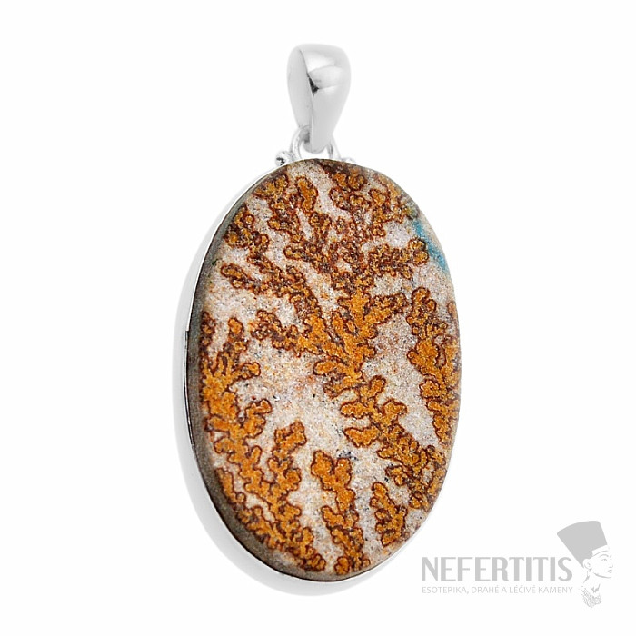 Silberanhänger mit deutschem dendritischem Psilomelan mit wunderschönem Muster, das an Äste oder Büsche erinnert, in erstklassiger Qualität. Ag 925. In einer wunderschön gearbeiteten Silberfassung stellt er ein wahres Schmuckstück dar, das ins Auge fällt! Die ockerfarbene Farbe in Kombination mit schwarzen „Pflanzen“ macht diesen Anhänger zu einem einzigartigen Schmuckstück! Sie erwerben hier direkt den abgebildeten Schmuck.