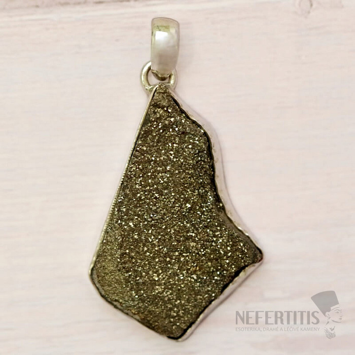 Wunderschöner Silberanhänger mit einem Regenbogenpyrit -Drusen . Regenbogenpyrit ist relativ selten und verdankt seine atemberaubende Farbe seinem erhöhten Eisengehalt. Ag 925. Sie erwerben hier direkt den abgebildeten Schmuck.