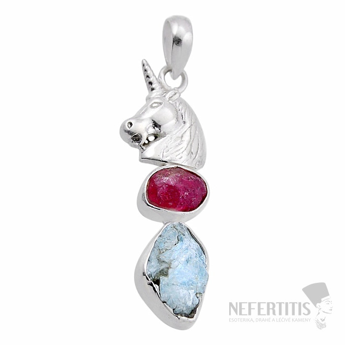 Anhänger mit einem wunderschönen, rohen blauen Aquamarin und einem rohen Rubin in Silberfassung. Der Aquamarin wird Sie auf Anhieb mit seiner klaren blauen Farbe, seiner Größe und seiner reinen, natürlichen Schönheit verzaubern. Dieser Stein zeichnet sich insbesondere durch ein wunderschönes Blau aus, das an einen kristallklaren Bach erinnert. Silber 925. Sie erwerben das abgebildete Schmuckstück.