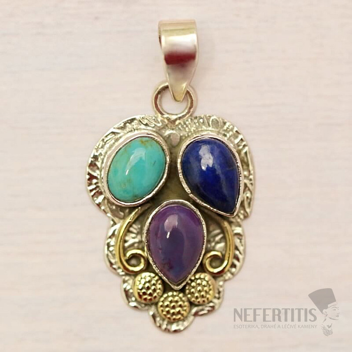 Außergewöhnlicher , teilweise vergoldeter Anhänger aus Silber mit Stücken aus natürlichem, gefärbtem Türkis , verbunden mit Kupfer zu eindrucksvollen Cabochons in wunderschöner purpur-violetter und blauer Farbe, sowie mit Lapislazuli . Diese Art von Schmuck erfreut sich weltweit großer Beliebtheit, da die Preise für massive Stücke aus natürlichem Türkis immer weiter steigen. Auf diese Weise hergestellte Cabochons sind heute eine der wenigen Möglichkeiten, Schmuck mit natürlichem Türkis zu einem relativ erschwinglichen Preis zu kaufen. Ag 925. Sie kaufen direkt den abgebildeten Schmuck.