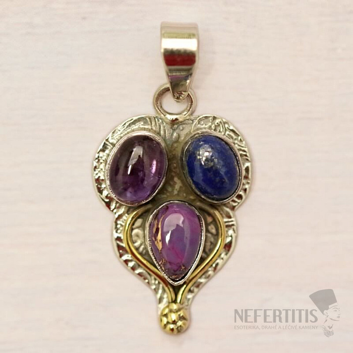 Außergewöhnlicher silberner, teilweise vergoldeter Anhänger mit Stücken aus natürlichem, gefärbtem Türkis , verbunden mit Kupfer zu einem eindrucksvollen Cabochon in wunderschöner purpur-violetter Farbe, mit Lapislazuli und Amethyst . Diese Art von Schmuck erfreut sich weltweit großer Beliebtheit aufgrund der ständig steigenden Preise für massive Stücke aus natürlichem Türkis. Auf diese Weise hergestellte Cabochons sind heute eine der wenigen Möglichkeiten, Schmuck mit natürlichem Türkis zu einem relativ erschwinglichen Preis zu kaufen. Ag 925. Sie kaufen direkt den abgebildeten Schmuck.