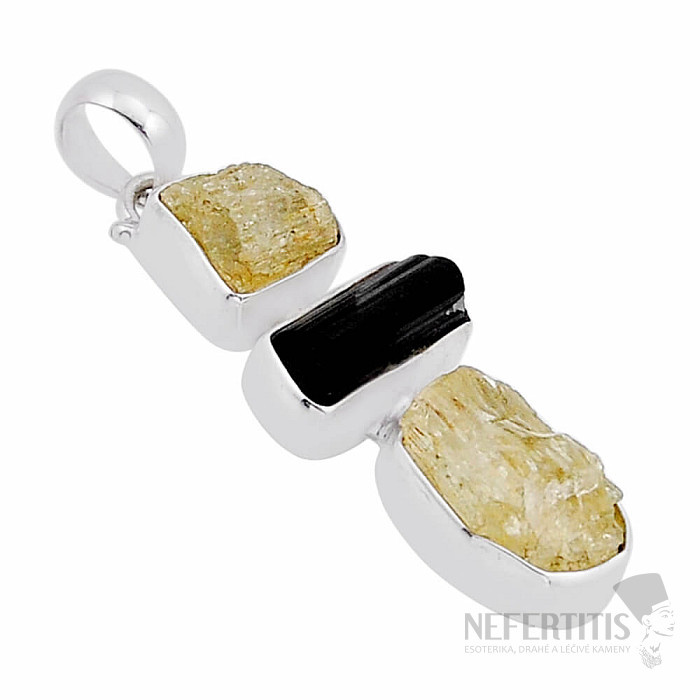 Attraktiver, eleganter, etwas geheimnisvoller Anhänger aus rohem schwarzem Turmalin, Skoryl und Skapolith in Silber. Er lindert Stress, Ärger, Angst und Negativität. Schwarze Rohturmaline weisen häufig Risse auf. Dies ist ihr charakteristisches Merkmal und der Beweis, dass Sie echten natürlichen Turmalin kaufen. Ag 925. Sie kaufen das abgebildete Schmuckstück.