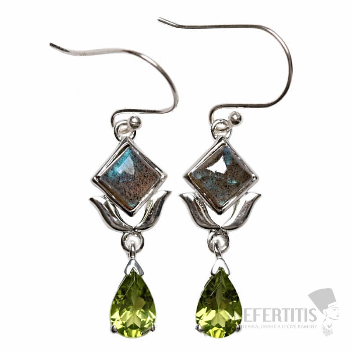 Attraktive Designer-Ohrringe aus Silber mit Labradoriten , die ein einzigartiges Farbenspiel aufweisen – das leuchtende Blau schimmert magisch im Licht – und geschliffenen Olivinen. Silber 925. Das angegebene Gewicht bezieht sich auf das gesamte Paar. Sie erwerben genau den abgebildeten Schmuck.