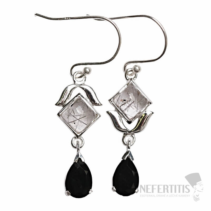 Attraktive silberne Designer-Ohrringe aus Kristall mit reichhaltigen Einschlüssen von schwarzem Turmalin (Skoryl) und geschliffenem Onyx. Silber 925. Die ungewöhnliche Optik des Steins, bedingt durch Einschlüsse, die feinen Linien ähneln, wird in einem exklusiven Schmuckstück vereint. Das angegebene Gewicht bezieht sich auf das gesamte Paar. Sie erwerben genau den abgebildeten Schmuck.