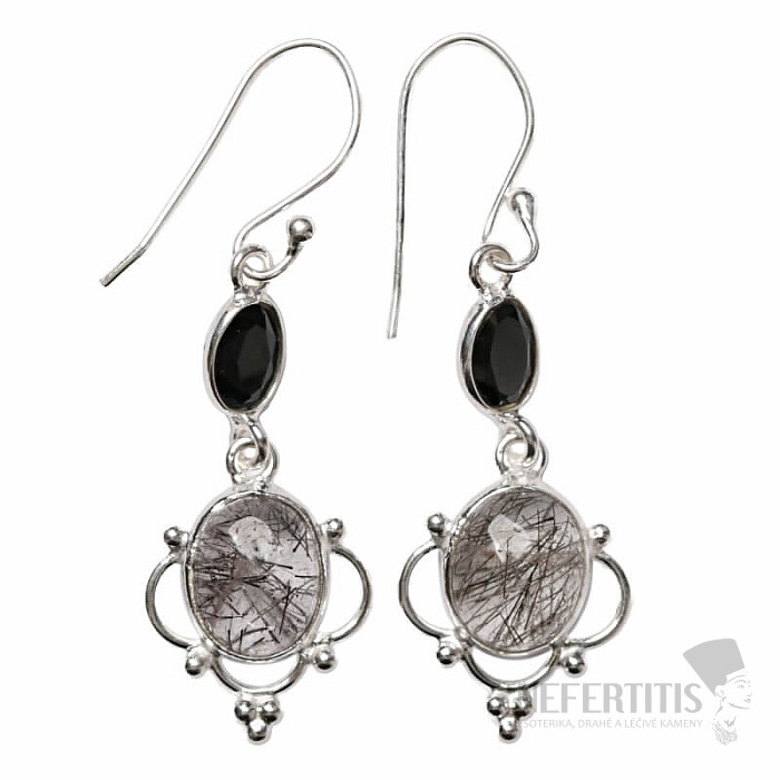 Attraktive silberne Designer-Ohrringe aus Kristall mit reichhaltigen Einschlüssen von schwarzem Turmalin (Skoryl) und geschliffenem Onyx. Silber 925. Die ungewöhnliche Optik des Steins, bedingt durch Einschlüsse, die feinen Linien ähneln, wird in einem exklusiven Schmuckstück vereint. Das angegebene Gewicht bezieht sich auf das gesamte Paar. Sie erwerben genau den abgebildeten Schmuck.