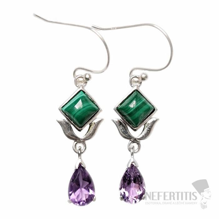 Attraktive Designer-Ohrringe aus Silber mit Malachit und geschliffenem Amethyst . Silber 925. Dank der typischen grünen Farbe und Maserung dieses wunderschönen Steins sowie seiner Größe sind die Ohrringe ein außergewöhnliches und unverwechselbares Accessoire für verschiedene Anlässe. Das angegebene Gewicht bezieht sich auf das gesamte Paar. Sie erwerben genau das abgebildete Schmuckstück.