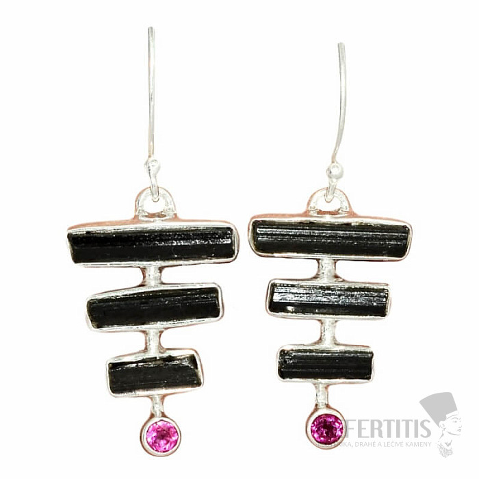 Attraktive silberne Designer-Ohrringe aus rohem schwarzem Turmalin ( Skoryl) und geschliffenem Rhodolith . Silber 925. Das angegebene Gewicht bezieht sich auf das gesamte Paar. Sie erwerben genau das abgebildete Schmuckstück.