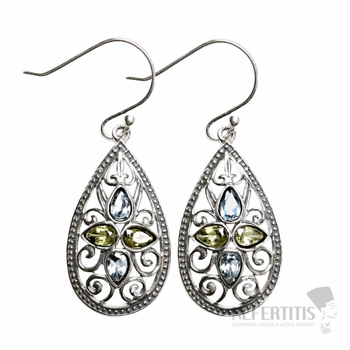 Attraktive silberne Designer-Ohrringe mit facettierten blauen Topasen und Olivinen. Silber 925. Das angegebene Gewicht bezieht sich auf das gesamte Paar. Sie erwerben genau das abgebildete Schmuckstück.