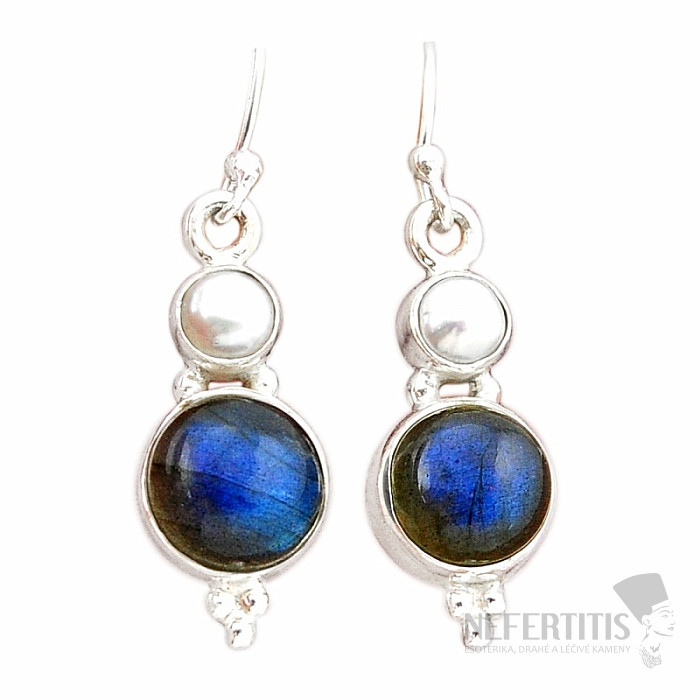 Wunderschöne Silberohrringe mit Labradoriten mit markantem Farbspiel, bei dem die leuchtend blaue Farbe bei Lichteinfall magisch leuchtet, und Perlen. Ag 925. Das angegebene Gewicht gilt für das gesamte Paar. Sie erwerben direkt das abgebildete Schmuckstück.
