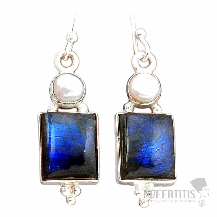 Wunderschöne Silberohrringe mit Labradoriten mit markantem Farbspiel, bei dem die leuchtend blaue Farbe bei Lichteinfall magisch leuchtet, und Perlen. Ag 925. Das angegebene Gewicht gilt für das gesamte Paar. Sie erwerben direkt das abgebildete Schmuckstück.
