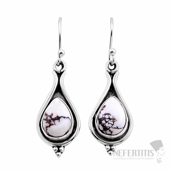 Silberohrringe mit Wildpferde-Magnesit aus Arizona. Silber 925. Diese Magnesitart zeichnet sich durch ein einzigartiges, unverwechselbares Muster aus – eine wunderschöne Marmorierung in weißem Magnesit. Das angegebene Gewicht bezieht sich auf das gesamte Paar. Sie erwerben den abgebildeten Schmuck.
