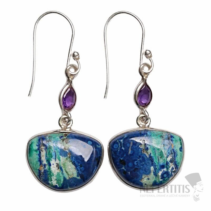 Exklusive, bezaubernde Silberohrringe mit Azurit in Malachit und geschliffenem Amethyst. Die Kombination aus Azurit und Malachit erinnert an die Vogelperspektive der Erde und macht dieses Schmuckstück außergewöhnlich und äußerst dekorativ. Silber 925. Sie erwerben genau das abgebildete Schmuckstück.