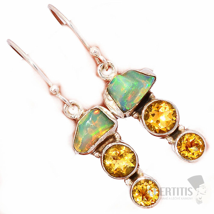 Bezaubernde Silberohrringe mit rohen, polierten Opalen und geschliffenen Citrinen, die ein wunderschönes Farbenspiel erzeugen. Silber 925. Beeindruckender und eleganter Schmuck, der schon beim Anblick Freude und Harmonie ausstrahlt. Äthiopische Opale, im Vergleich zu australischen, leuchten in einem geradezu neonfarbenen Farbenmeer. Auch wenn es auf den ersten Blick nicht so scheint, wird das Farbenspiel, das bei jedem Lichteinfall aus den Opalen dieser Ohrringe erstrahlt, nicht nur Sie, sondern Ihre ganze Umgebung verzaubern. Das angegebene Gewicht bezieht sich auf das gesamte Paar. Sie erwerben genau den abgebildeten Schmuck.