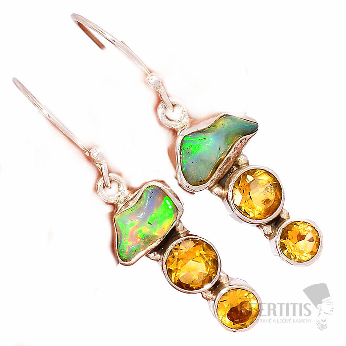 Bezaubernde Silberohrringe mit rohen, polierten Opalen und geschliffenen Citrinen, die ein wunderschönes Farbenspiel erzeugen. Silber 925. Beeindruckender und eleganter Schmuck, der schon beim Anblick Freude und Harmonie ausstrahlt. Äthiopische Opale, im Vergleich zu australischen, leuchten in einem geradezu neonfarbenen Farbenmeer. Auch wenn es auf den ersten Blick nicht so scheint, wird das Farbenspiel, das bei jedem Lichteinfall aus den Opalen dieser Ohrringe erstrahlt, nicht nur Sie, sondern Ihre ganze Umgebung verzaubern. Das angegebene Gewicht bezieht sich auf das gesamte Paar. Sie erwerben genau den abgebildeten Schmuck.