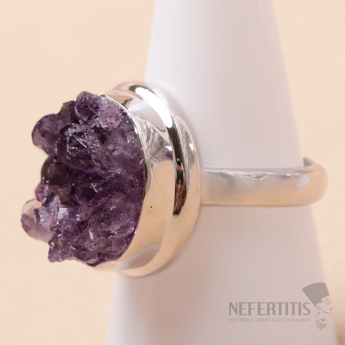 Bezaubernder Silberring mit einer Druse aus tiefviolettem natürlichem Amethyst . Silberschmuck mit einer Druse aus Amethyst ist auf dem Markt recht selten, wir empfehlen diesen Ring allen Amethystliebhabern wärmstens. Die Druse hat eine wunderschöne Form und perfekt geformte Kristalle mit einer nahezu gleichmäßigen violetten Farbe. Ag 925. Sie kaufen direkt das abgebildete Stück. Die Druse ist ca. 1,8 cm groß.