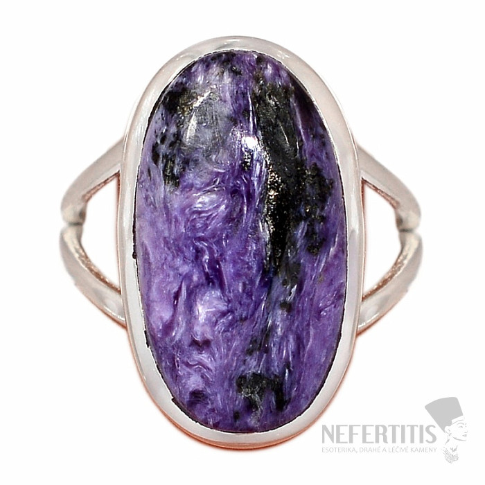 Silberring mit Charoit. Wunderschön violett gefärbter Charoit verzaubert Sie nicht nur durch seinen seidigen Glanz, sondern auch durch die Verwandlung der Zeichnung im wechselnden Licht. Ag 925. Steingröße ca. 1,7 cm. Sie erwerben das abgebildete Schmuckstück.
