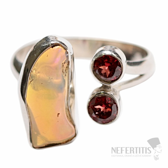 Silberner Designerring mit äthiopischem Opal und geschliffenen Granaten. Silber 925. Dieser Ring besticht nicht nur durch seine Form, sondern vor allem durch seine hochwertige Verarbeitung. Der mit Steinen besetzte Teil hat einen Durchmesser von ca. 2,2 cm . Sie erwerben das abgebildete Schmuckstück.