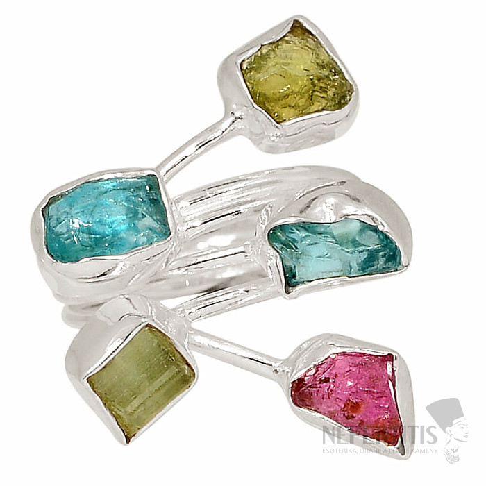 Silberner Designerring mit verschiedenfarbigen Turmalinen, Olivinen und Apatiten. Silber 925. Ein bezauberndes Schmuckstück mit funkelnden Farben wunderschöner, natürlicher Turmaline. Dieser Ring besticht nicht nur durch seine Form, sondern vor allem durch seine hochwertige Verarbeitung. Die Größe des mit Steinen besetzten Teils beträgt ca. 2,6 cm . Sie erwerben genau das abgebildete Schmuckstück.
