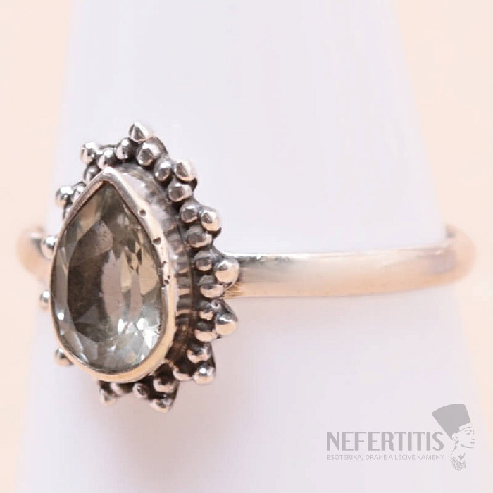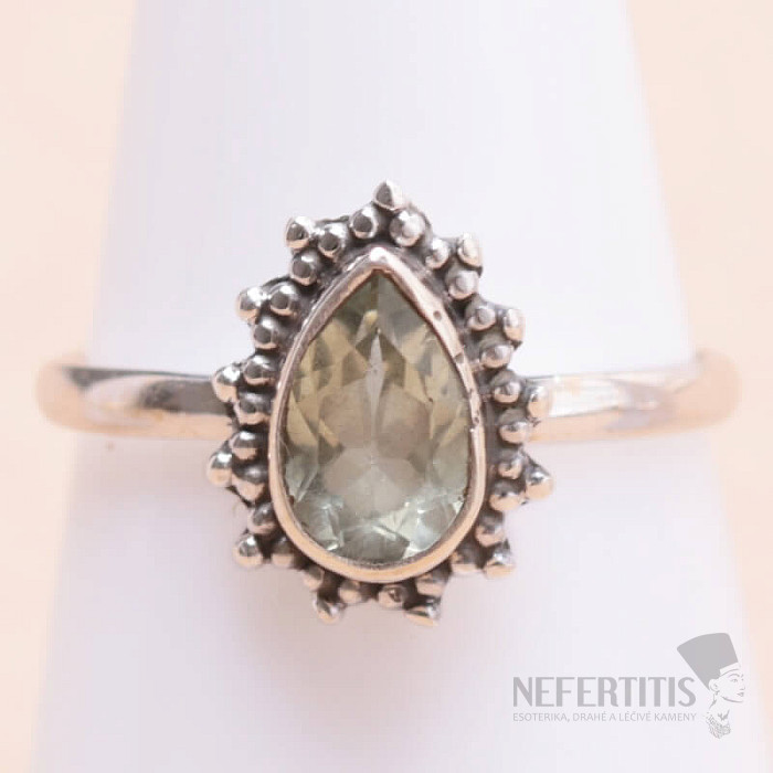 Einzigartiger Ring mit geschliffenem grünem Amethyst - Prasiolith. Lassen Sie sich von der zarten und vor allem ungewöhnlichen grünen Farbe des Amethysts verzaubern. Einzigartiger Schmuck dank der ungewöhnlichen Farbe des Amethysts. Grüner Amethyst kommt als solcher nicht in der Natur vor, sondern entsteht, ähnlich wie die meisten Citrine auf dem Markt, durch die Behandlung von Amethystkristallen. Dieser Stein wurde erstmals um 1950 in Amerika auf den Markt gebracht und erhielt damals den Namen Prasiolith, eine Kombination der griechischen Wörter für Schnittlauchgrün und Stein. Grüne Amethyste kommen meist aus Brasilien , aus bekannten Amethystfundorten wie Minas Gerais und Rio Grande do Sul. Steingröße ca. 0,8 cm. Ag 925. Sie kaufen das abgebildete Schmuckstück.