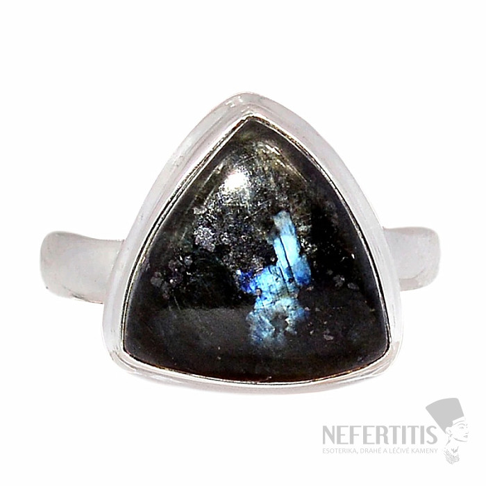 Wunderschöner und einzigartiger Silberring mit natürlichem Larvikit, dessen Schimmer an Sterne am Nachthimmel erinnert. Dieser Stein wird aufgrund seines regenbogenfarbenen Farbenspiels im einfallenden Licht auch schwarzer Mondstein oder schwarzer Labradorit genannt. Silber 925. Lassen Sie sich von der Schönheit und dem Spiel seiner leuchtenden Farben verzaubern, die an Mondstein und Sternenhimmel erinnern. Steingröße ca. 1,3 cm. Sie erwerben das abgebildete Schmuckstück.