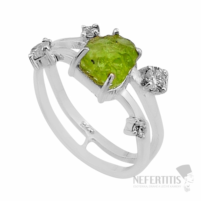 Silberring mit rohem Olivin und Zirkonen. Silber 925. Olivingröße ca. 0,7 cm. Sie erwerben das abgebildete Schmuckstück.