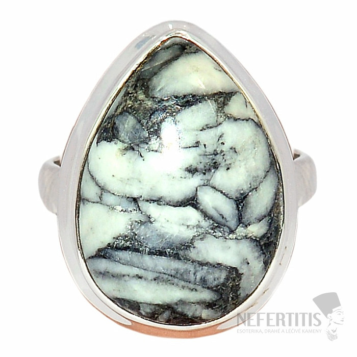 Silberring mit einem dekorativen, seltenen Pinolith in Silberfassung. Silber 925. Pinolith ist ein graphitpigmentierter, hellgrauer bis fast schwarzer Dolomit mit Einschlüssen weißer Magnesitkörner, die an Kiefernsamen erinnern. Daher leitet sich auch der Name Pinolith ab, da Kiefer im Lateinischen „pinus“ heißt. Der Stein hat einen Durchmesser von ca. 2 cm. Sie erwerben das abgebildete Schmuckstück.