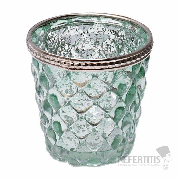 Retro-Kerzenhalter aus Glas in grüner Farbe für Tee- und Votivkerzen. Der Kerzenhalter ist mit einem Metallstreifen verziert, um den Glanz zu erhöhen. Die Größe beträgt ca. 7 x 7 cm.